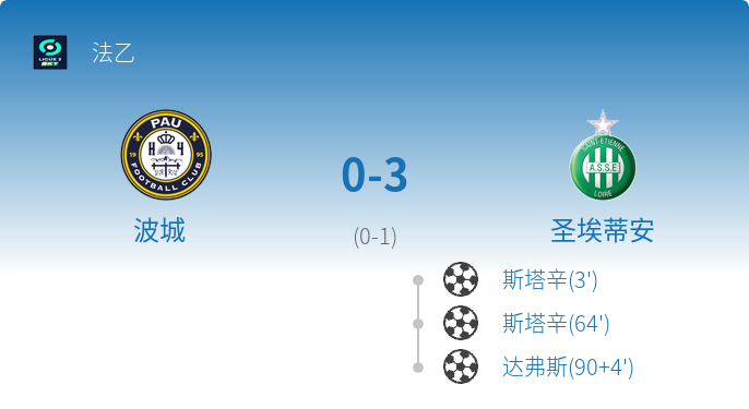 比赛概述 2026年3月1日,法乙第25轮,圣埃蒂安客场挑战波城。比赛中,圣埃蒂安凭借早开局的进球和下半场的强势表现,最终以3-0完胜对手,全取三分。